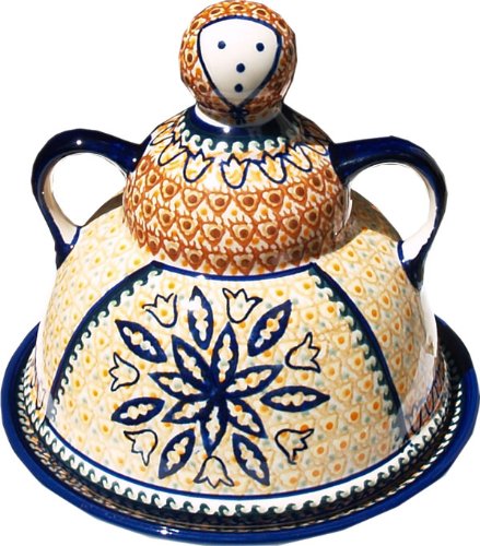 Invented to keep cheese at room temperature (and therefore the best flavor) and to prevent it from drying out, the famous Polish Pottery Cheese Lady, in the Unikat Signature Patterns,Is a fabulous piece of Polish Stoneware crafter's artwork. The Polish Pottery Cheese Lady is also ideal for serving fresh pancakes, as it will keep them warm for a long period of time, and it would make a lovely decoration for your kitchen or China Hutch.